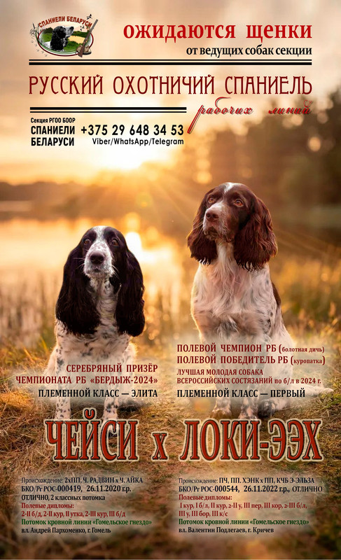 ![]() В секции РГОО "БООР" "Спаниели Беларуси" ожидаются щенки от русских охотничьих спаниелей ПЧ, ПП Локи-Ээх и Чейси – одних из лучших представителей породы в Беларуси. Данная вязка является плановым кинологическим мероприятием секции спаниелей РГОО «БООР» «Спаниели Беларуси». Информация о родителях: Кобель: Локи-Ээх Возраст: 26.11.2022 г.р. Владелец: Валентин Подлегаев (г. Кричев), член БООР. Титулы и достижения: