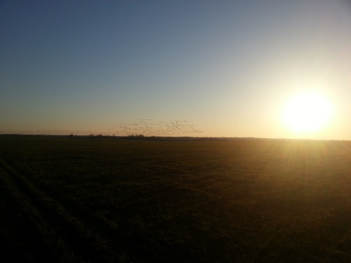 Сидя вечером у костра, в ожидании тяжелой ночи, перед глазами скудная полянка из продуктов.  Лук, наш белорусский яблык, картошка, обязательно запеченная в золе. В бутылке морс из клюквы. И настойка на местной хлебной, на сушеной Антоновке. Кусочек сала. Пожаренного на прутике у костра. Глядя на огни костра и заката, хочется остановить время на мгновение. Яркое солнце падает в горизонт, и тебя отрывает от мыслей о прекрасном, поднимающаяся тысячная стая с кормового поля. Даже засосало под ложечкой от этого огромного удовольствия. Весна, Родина, прекрасный вечер, любимая пища, гуси и звонок…любимой жены, по нотам в голосе она чувствует, что я кайфую. Она была бы рядом, но еще холодно, подождем тепла.