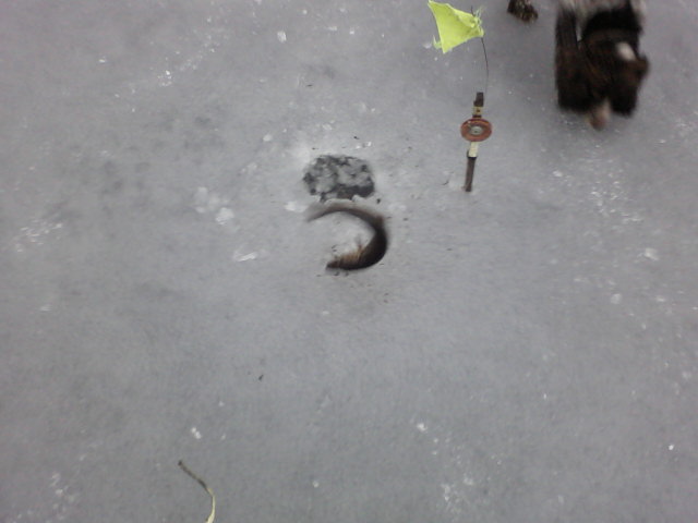 На перспективный разлив не залезли - какая боль-какая боль...вернее я,из нас двоих,залез полазил отошёл метров 100 от берега и ...понял...бдительность,в перемешку с осторожностью моей -Не дремлют! А бдят!)) И тянут меня,неумолимо на берег,ибо лёд 6-5-4-4,5 см,расположенный пятнами ,5 см ищо куда не шло,но треск стоит,уши закладывает,но не прогибается,пробивается с 3 средних ударов пешни, 4-4,5 см это что-то,даже для моих ,зачерственелых,нервов,со 2-го среднего удара пешни -гнётся-трещит-пускает круговые трещины(для тех кто не в курсе -это самые опасные и последняя стадия перед "бульк"),вода заходит из лунок на лёд - в общем это не перволёдный-Крепкий лёд ...Добило- две затянутые полыньки(по 0,5-1 метр шириной и 1-1,5 метра в длину,глубина в одном месте,вместе с илом до 0,5-0,6 метров,вторая до яй..,0,7-0,8 метра,видимо после 1.01.2014)среди насверленных старых лунок(ночью и днём 1.01.2014 морозик дотягивал до -2-3 С)...Переехали на другой разлив,лёд -7-8 см ,под полынями(там всегда самые "лакомые кусочки" -по другому и не бывае ) около 5 см(гнётся,истошно трещит,но держит!)...