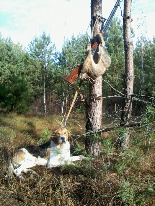 подъем (не первый за день, уже погоняли зайца, заранили лису из под гона), давай перекус делать - садимся только, и тут гон, и резко на нас, рюкзаки кинули - только разбежались и выстрел, заяц-русак крупный добыт глубоко в лесу на делянке, выжлец приюежал НО не подходит и круги режет, на зайца добытого никакого внимания - возвращается и попер.