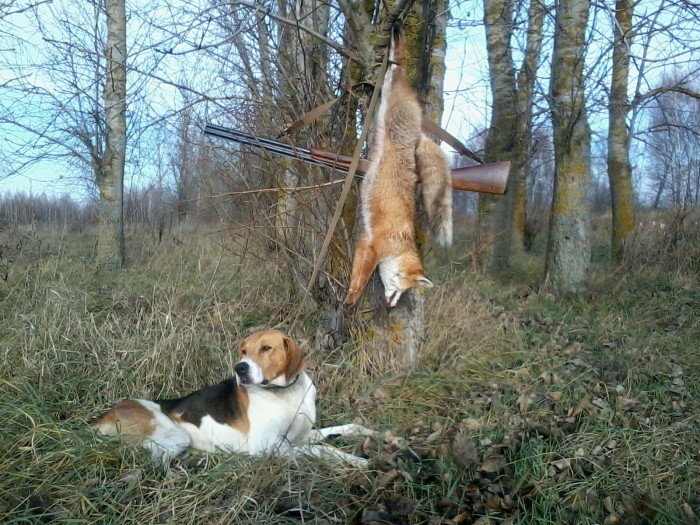 Уже, как сутки, лил проливной дождь. Ждали часов до 10, надеялись, что всё же ливень успокоится, но всё напрасно. Дождь набрал ещё большую силу. Почти смирился, что останусь дома. Решил хоть один выходной посвятить семье. И тут звонок друга, как остаться дома, собирайся, надо ехать. Быстрые сборы, заехал за отцом, сажу собак в машину, забираю друга с отцом и их выжлецом и мчим четвером в угодья. Дождь вроде как ослаб. Подъезжаем к месту охоты, дорога вся разбита, верхний слой как масло. Отразилось хождение тяжёлой сельхоз техники, буквально вчера в этом месте убирали кукурузу. Кое как пробившись к лесу, замечаем стоявших на съезде в лес два УАЗа и Ниву. Опоздали, кто-то уже охотится. Пока разворачивался, вышли два знакомых охотника и пояснили, что их бригада охотится здесь на копытных. Желаем им удачи, быстро решаем куда переехать и снова в путь. Через минут 30 на месте. Дождь снова пошёл с новой силой. Хорошо, что прихватил костюм-дождевик, спасибо тёще, ещё с вечера передала постиранный жене. Пока я одеваю дождевик, охотники собрали ружья и отправляются занимать лаз. Решили зацепить край леса, от деревни, около житного поля.  Спускаю собак со шворок и они сразу уходят в полаз. Постояв минут пять на месте, начинаю не спеша продвигаться полем по краю леса. Так проходит минут 25-30. Дождь льёт как из ведра. В голове начинают мелькать мысли, какая может быть охота в такую погоду, сидел бы дома в тепле, пил бы чай с пирожками, с обеда в баньку, а нет, попёрся… И тут еле улавливаю вдалеке голос собак. Сразу не могу понять в какую сторону гонят. Шум дождя по опавшей листве мешает это сделать. Вроде гон идёт в глубь леса. Сообщаю остальным, что собаки погнали. Через минут десять собак уже не слышу и начинаю продвигаться на прямую через лес в сторону, где последний раз слышал собак. Выйдя на лесную дорогу, встречаю отца. Говорит, что прошли от него в метрах 300, не смог подстроится. Уточняю, куда ушёл гон, и по просеке ухожу в ту сторону. Пройдя квартал в глубь леса, слышу еле уловимый ухом вдалеке гон, идущий в сосновых посадках с другой стороны леса. Сообщаю напарникам и сам бегу туда. Подойдя ближе слышу уже отчётливо собак, гонят азартно, быстро продвигаясь по посадкам к краю леса, к мосту. Там обычно зверь, по узкому клину сосновой посадки переходит в другой лес, за границу нашего района в соседний. Сил бежать уже нет, перехожу на шаг, двигаясь к мосту. И тут звучит дуплет. Через минуту-две собаки замолкают. Звонит телефон. Поднимаю и слышу голос друга: «Дошла, была лиса»! Подхожу к нему, берем собак на шворки и ждём остальных. Дождавшись старших, решаем, что делать дальше. Они командуют обед. На часах и правда уже 14 часов дня. Разместились в уютно сделанной лесниками беседке, не спеша обедаем и согреваемся чаем. Все уже промокли до нитки, один я ещё относительно сухой, о чём ещё раз мысленно благодарю тёщу. Пообедав, решаем забрать островки кустарника с болотинами, одиноко расположенного в полях. Запускаем собак, а сами растягиваемся с двух сторон, продвигаемся вдоль кустов. Ну вот уже почти конец, вижу, как с дальнего края кустов вышли собаки. Подзываю их, забираю на поводки и к машинам. На сегодня хватит. Из-за сильного дождя желания доставать телефон, копаясь во внутреннем кармане и фотографировать не было.
