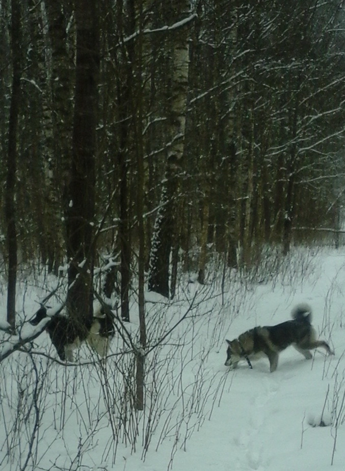 В общем, с двумя нерабочими лайками (шестимесячного щенка, считаю дитём горьким, которого основная добыча должна быть максимум мышь, возможно я не прав) решили подышать свежим воздухом в лесу в неохотничий сезон. Сразу же сделали несколько ошибок - пошли искать белку в центр массива спелого елового леса, а надо бы по краям. И время напуска приближалось к 11.00. Некоторые белки похоже уже отобедали. В итоге сыскали в часов 12 один беличий след протропили от нечего делать пару сотен метров (лучше бы, наверное, попробовали куницу - была ночью точно). Плюнули пошли дальше. Надежды таяли на глазах - мой кобель не отходил дальше 100 метров в основном крутился у ног, а малыш после того, как ему сделали пару хваток боялся составлять ему компанию.