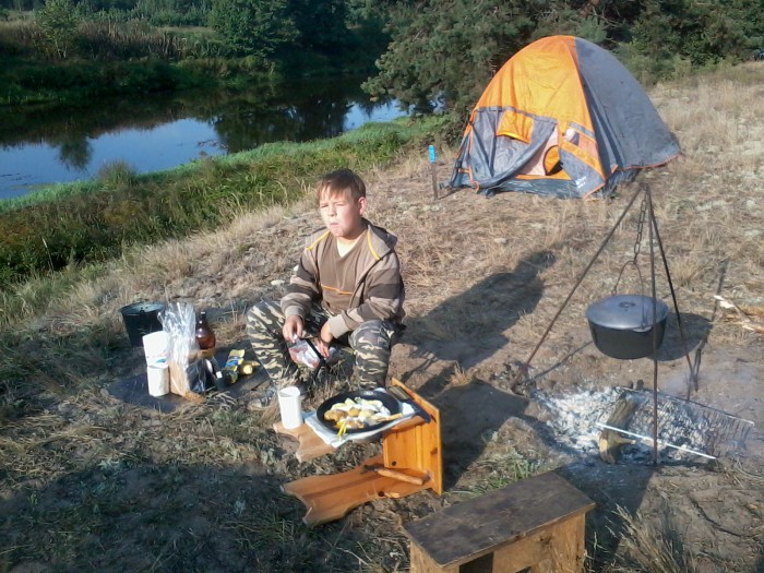 На лодке па рацэ Арэсе так вообще готов сутки плыть. В последний день лета (подарок перед школой) уехали с ночёвкой   на берег реки (сын целое лето просился в палатке переночевать на природе). Сыну очень понравилось.
